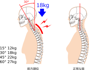 その重たい頭が体の中心から前にズレると,首や肩,背中,腰にまで負担がかかり,結果として全身の姿勢が崩れていきます。